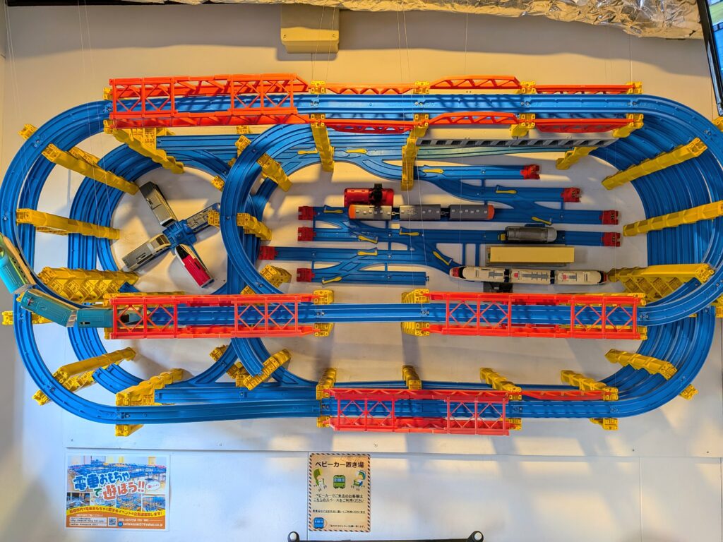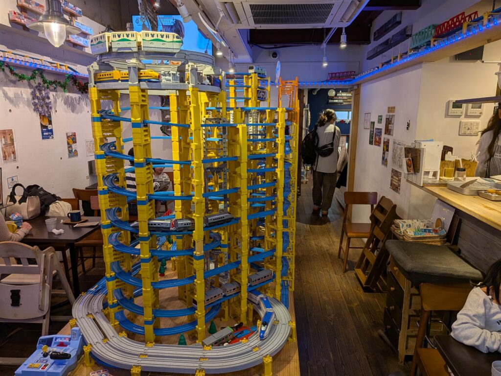 そして、扉を開けて店内に入ると、巨大なプラレールの線路が縦横無尽に張り巡らされています。実際に電車がガタゴトと音を立てて走る様子は、子どもだけでなく大人まで思わず見入ってしまうほど迫力満点です。