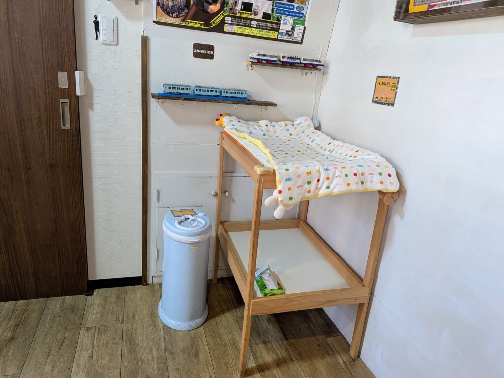 赤ちゃん連れでも安心して利用できるよう、店内にはおむつ交換台が完備されています(おむつ用ごみ箱もあり)。