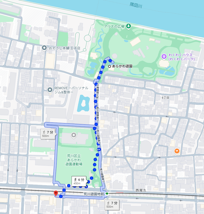 あらかわ遊園から「子鉄」までは、子どもの足でも比較的アクセスしやすい距離に位置しています。大人の足で徒歩7分ですので、子ども連れだと10分強は見ておいた方が良いと思います。