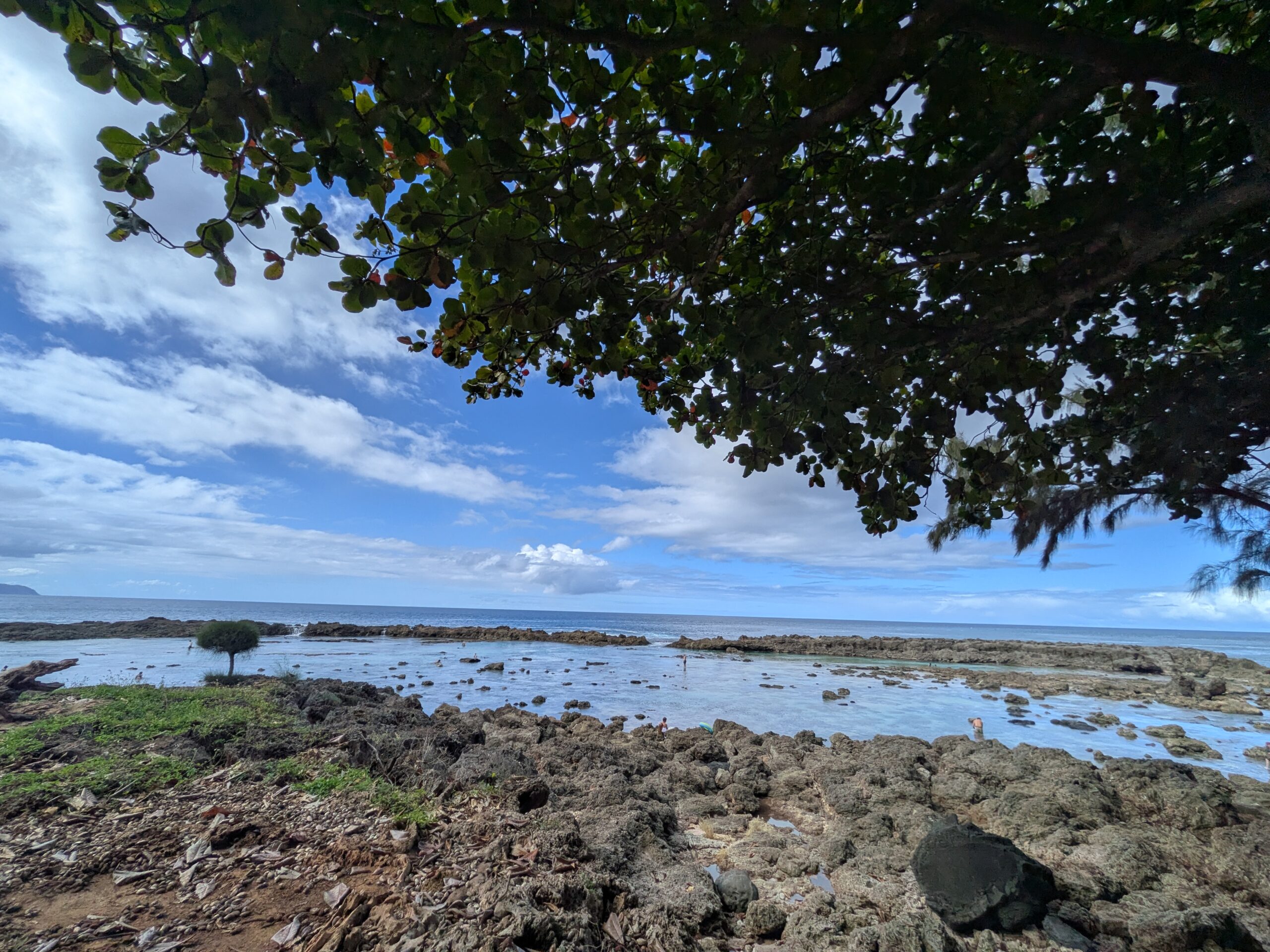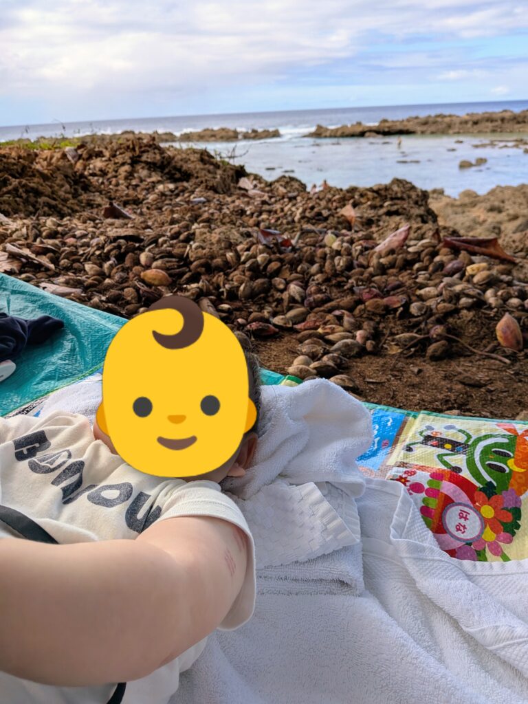 上の写真の通り、遠浅ではあるのですが、ゴツゴツの岩が続いているので、たしかに靴底がしっかりした厚みのあるシューズは必須です。(素足だとすぐに出血してしまいそう)